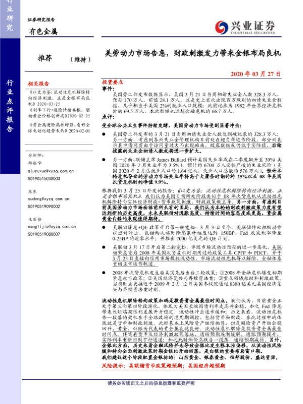 【兴业证券】【20200327】美劳动力市场告急,财政刺激发力带来金银布局良机-6页 行业研究