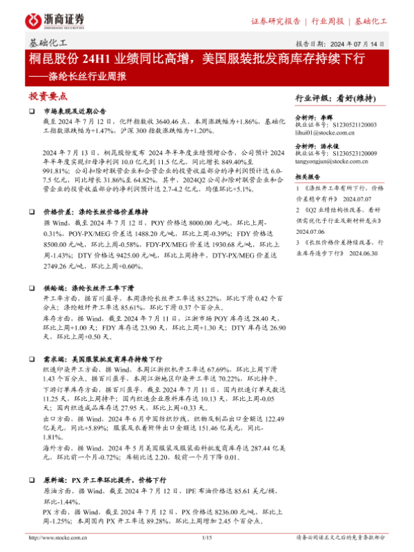 【浙商证券】【20240714】20240714-浙商证券-涤纶长丝行业周报:桐昆股份24H1业绩同比高增,美国服装批发商库存持续下行-15页 行业研究