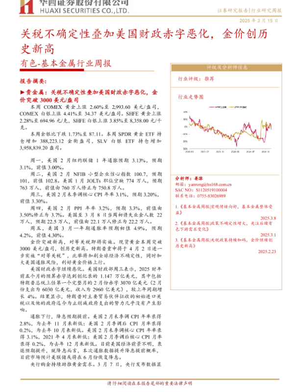 【华西证券】【20250315】20250315-华西证券-有色-基本金属行业周报:关税不确定性叠加美国财政赤字恶化,金价创历史新高-23页 行业研究