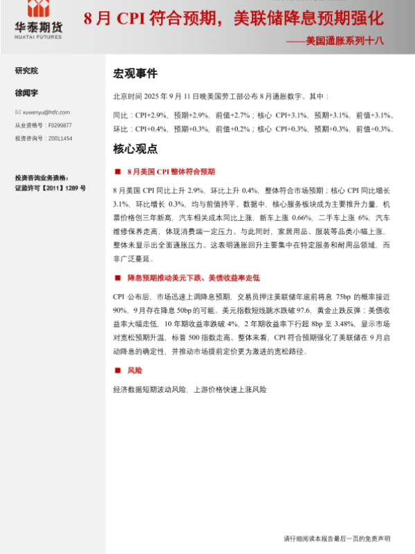 【华泰期货】【202509】8月CPI符合预期,美联储降息预期强化-6页 证券期货研究报告
