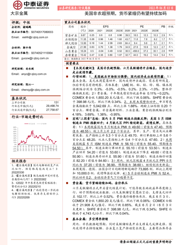 【中泰证券】【20220603】20220603-中泰证券-大宗金属行业周报:美国非农超预期,货币紧缩仍有望持续加码-25页 行业研究