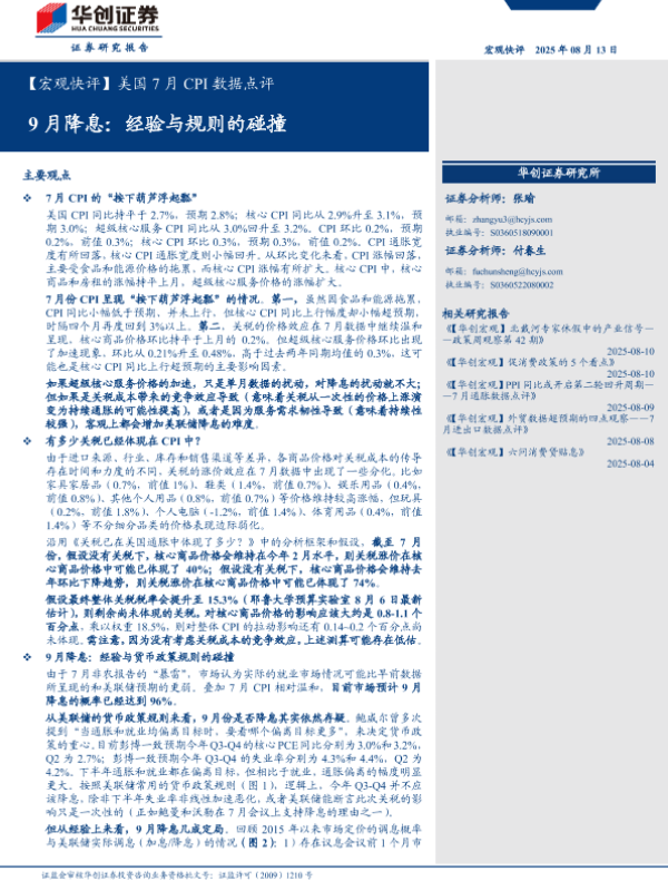 【华创证券】【202508】【宏观快评】美国7月CPI数据点评:9月降息,经验与规则的碰撞-13页 证券期货研究报告