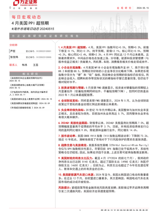 【方正证券】【20240515】海外市场每日动态:4月美国PPI超预期-10页 行业研究