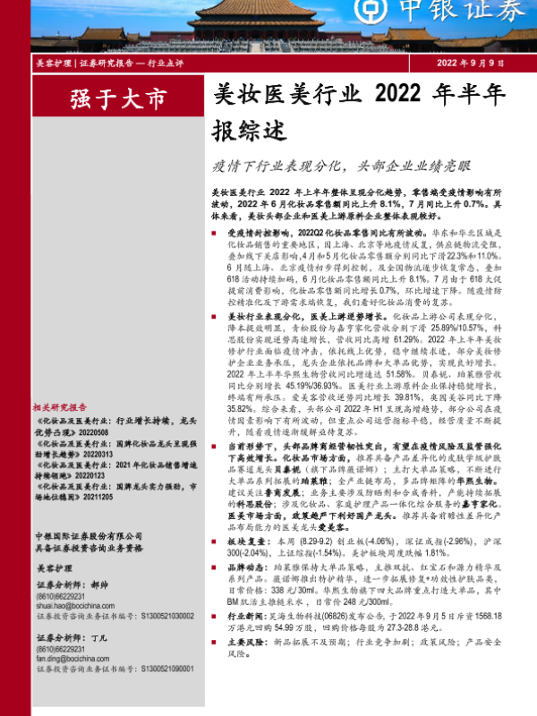 【中银证券】【20220909】美妆医美行业2022年半年报综述:疫情下行业表现分化,头部企业业绩亮眼-17页 行业研究