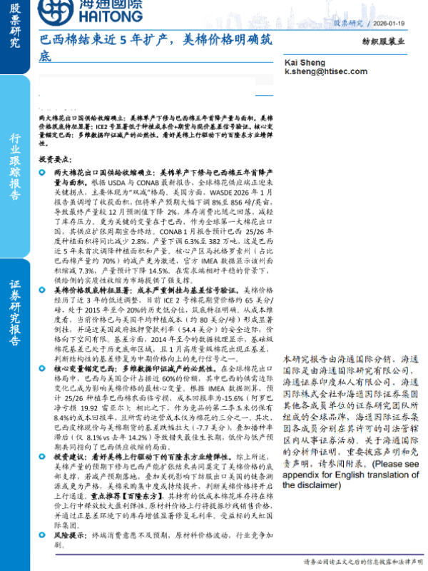 【海通国际】【202601】巴西棉结束近5年扩产 美棉价格明确筑底-16页 证券期货研究报告