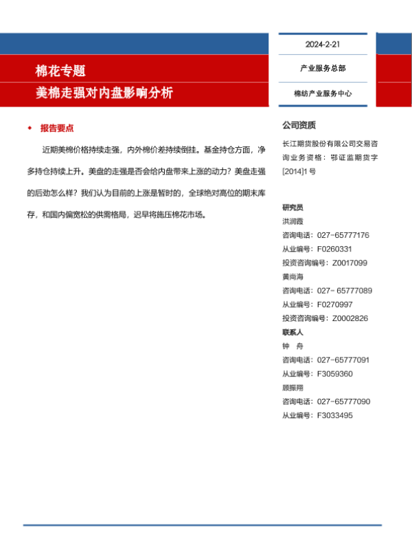 【长江期货】【20240221】棉花专题:美棉走强对内盘影响分析-11页 行业研究