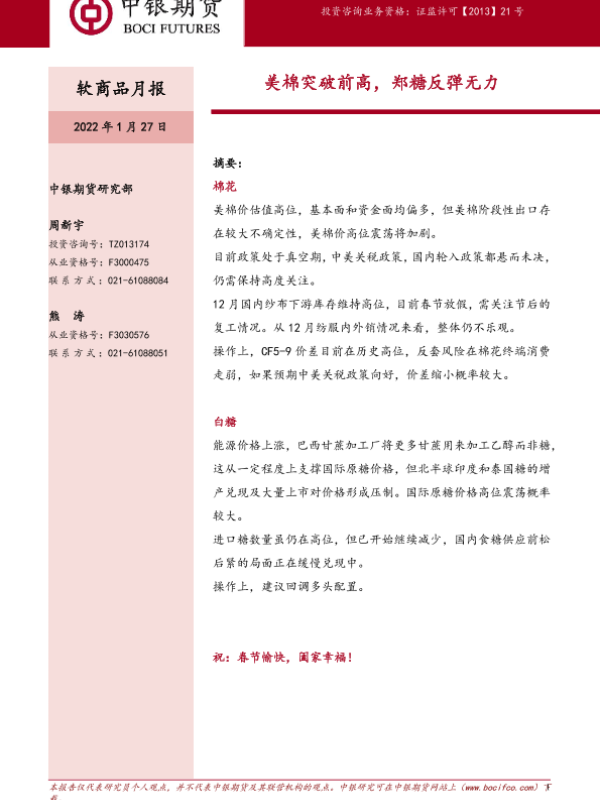 【中银期货】【20220127】软商品月报:美棉突破前高,郑糖反弹无力-15页 行业研究