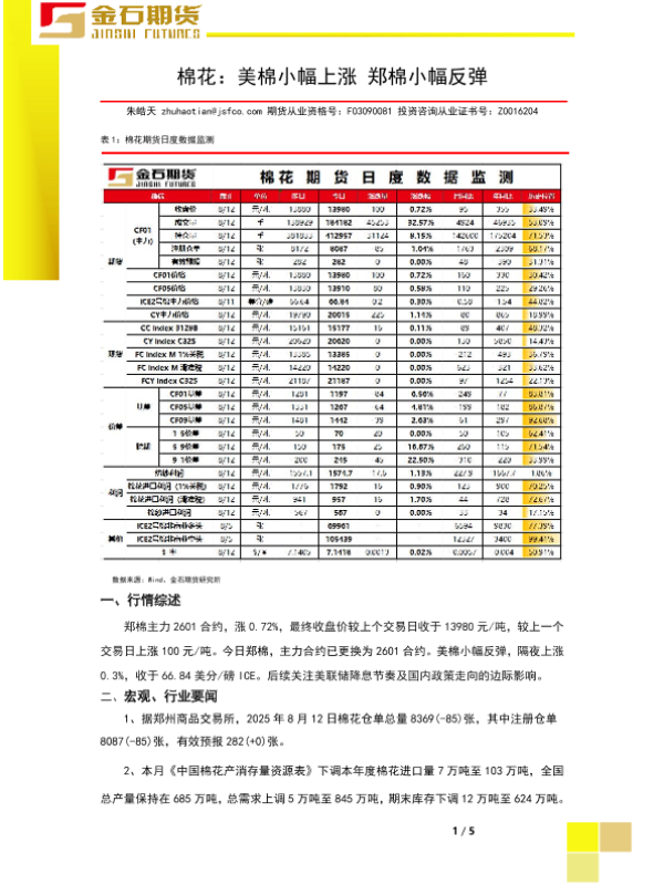 【金石期货】【20250812】金石期货-棉花日报:美棉小幅上涨,郑棉小幅反弹-5页 证券期货研究报告