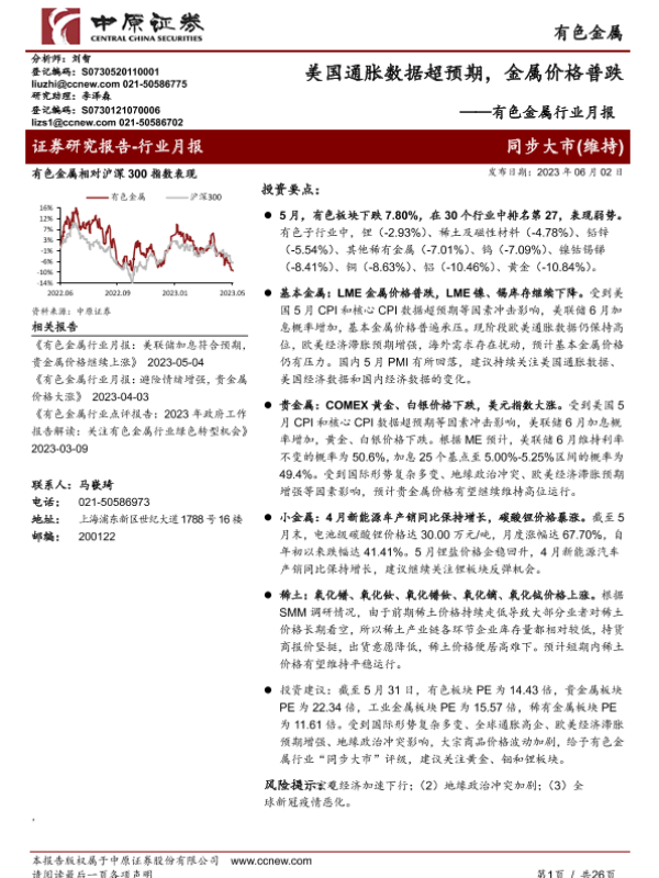 【中原证券】【20230602】20230602-中原证券-有色金属行业月报:美国通胀数据超预期,金属价格普跌-26页 行业研究