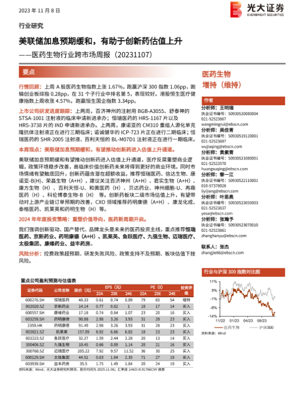 【光大证券】【20231108】医药生物行业跨市场周报:美联储加息预期缓和,有助于创新药估值上升-24页 行业研究