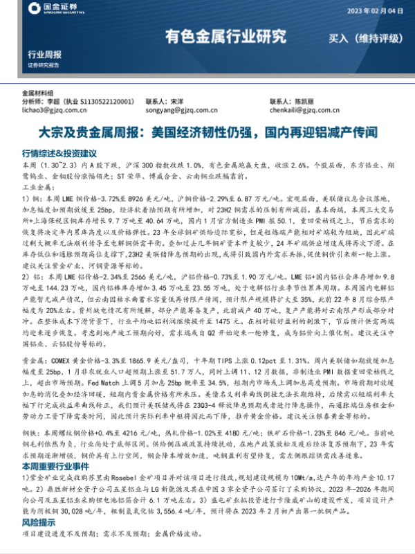【国金证券】【20230204】20230204-国金证券-大宗及贵金属周报:美国经济韧性仍强,国内再迎铝减产传闻-13页 行业研究