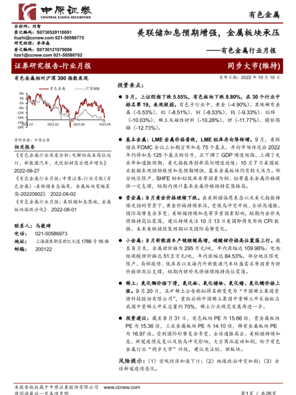 【中原证券】【20221010】20221010-中原证券-有色金属行业月报:美联储加息预期增强,金属板块承压-26页 行业研究