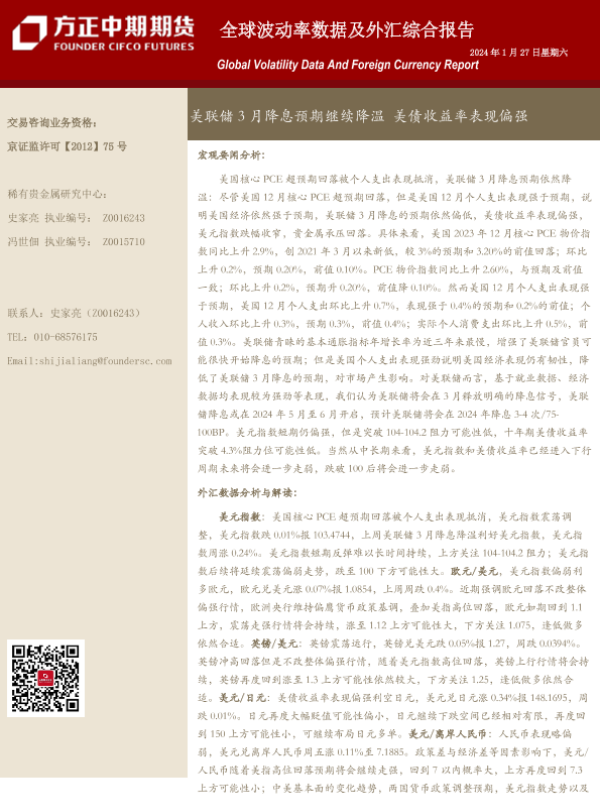 【方正中期期货】【20240127】全球波动率数据及外汇综合报告:美联储3月降息预期继续降温 美债收益率表现偏强-18页 行业研究