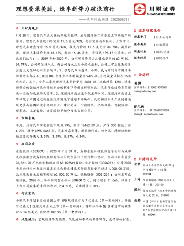 【川财证券】【20200801】20200801-川财证券-汽车行业周报:理想登录美股,造车新势力破浪前行-10页 行业研究