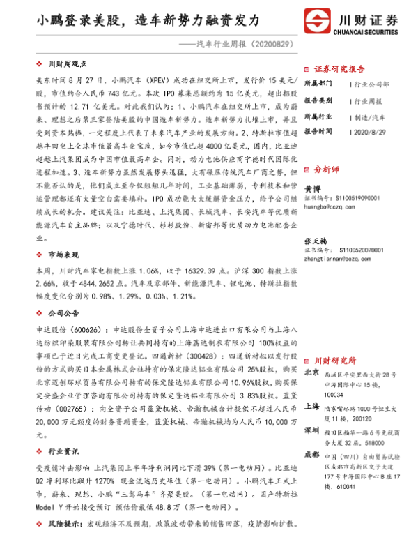 【川财证券】【20200829】20200829-川财证券-汽车行业周报:小鹏登录美股,造车新势力融资发力-10页 行业研究