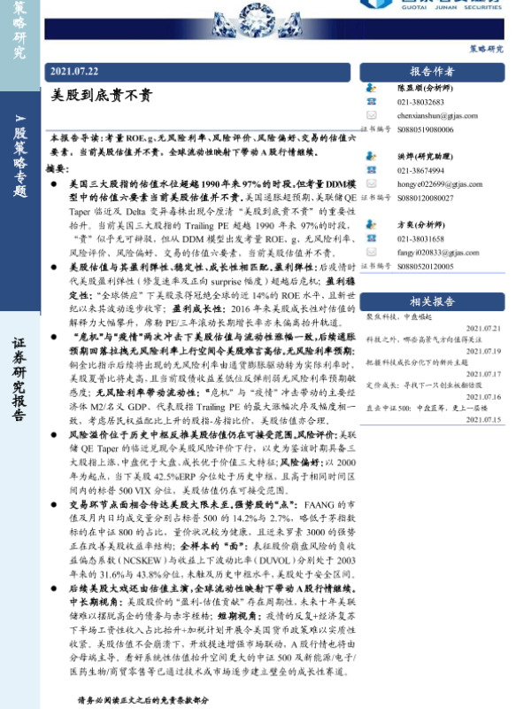 【国泰君安证券】【20210722】美股到底贵不贵-22页 行业研究