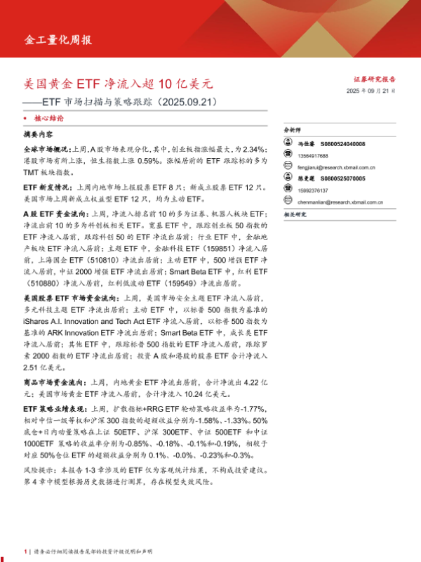 【西部证券】【202509】ETF市场扫描与策略跟踪:美国黄金ETF净流入超10亿美元-21页 证券期货研究报告