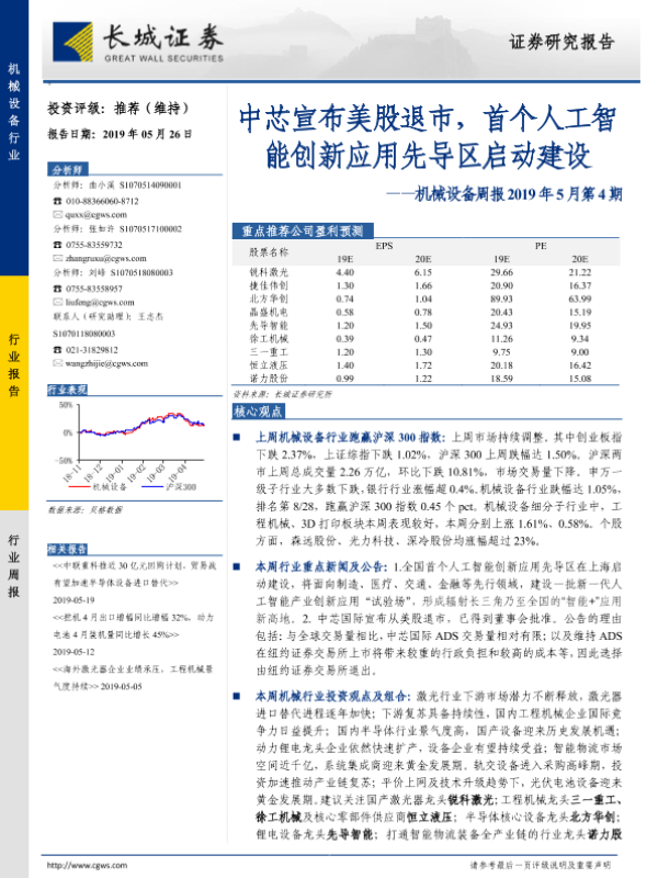【长城证券】【20190526】长城证券-机械设备周报2019年5月第4期:中芯宣布美股退市,首个人工智能创新应用先导区启动建设-11页 行业研究