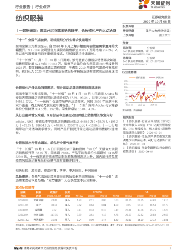 【天风证券】【20201008】纺织服装十一数据跟踪:降温开启羽绒服销售旺季,长假催化户外运动消费-2页 行业研究