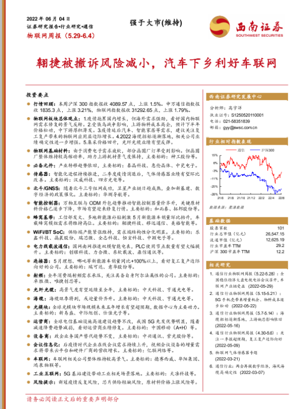【西南证券】【20220604】20220604-西南证券-物联网周报:翱捷被撤诉风险减小,汽车下乡利好车联网-21页 行业研究