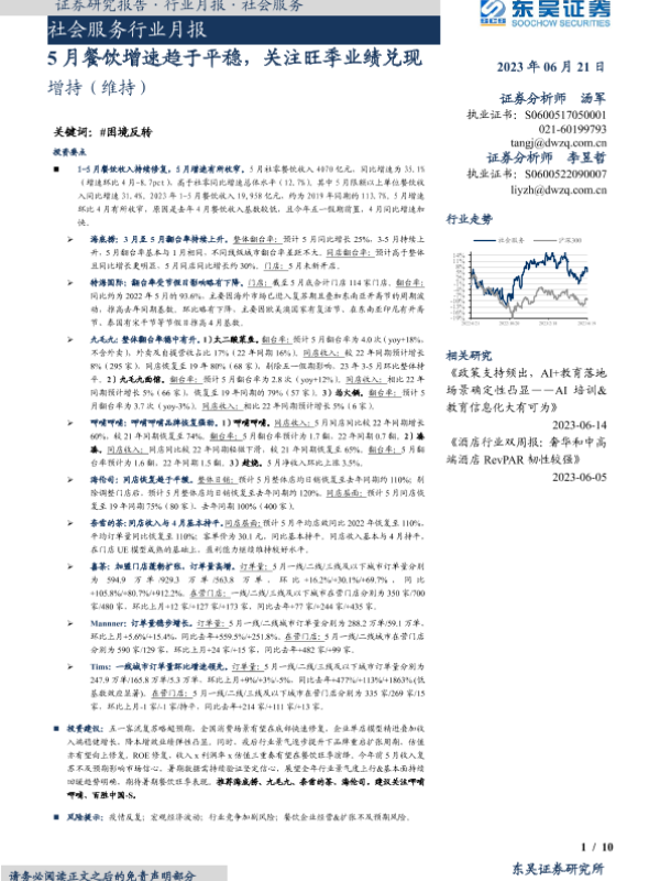 【东吴证券】【20230621】社会服务行业月报:5月餐饮增速趋于平稳,关注旺季业绩兑现-10页 行业研究