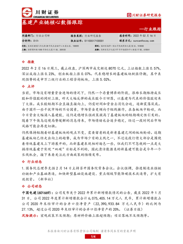 【川财证券】【20220216】基建产业链核心数据跟踪-4页 行业研究