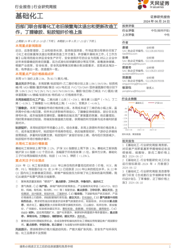 【天风证券】【20240624】2024-06-24-基础化工行业报告-四部门联合部署化工老旧装置淘汰退出和更新改造工作-丁腈橡胶、粘胶短纤价格上涨-20页 行业研究