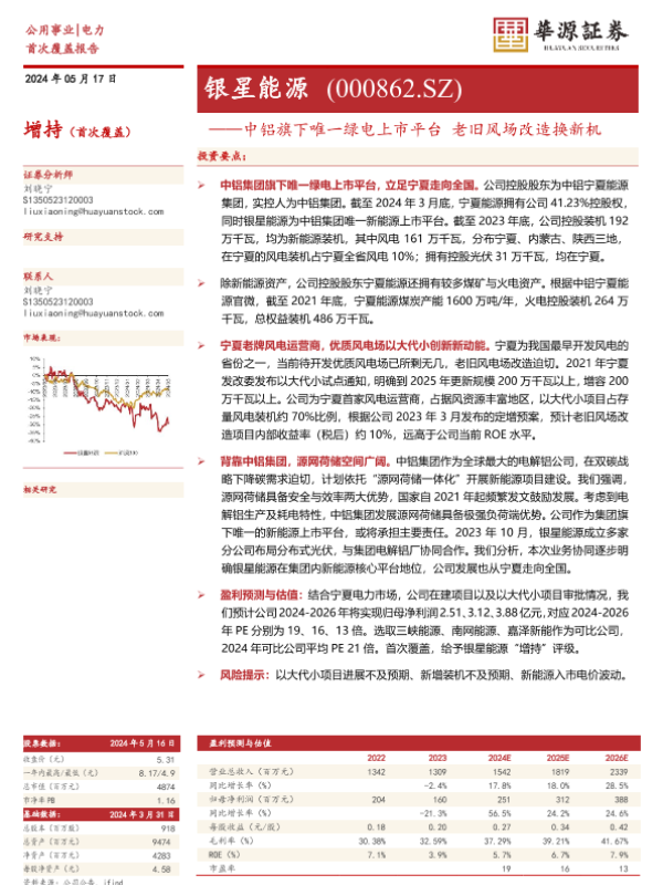 【华源证券】【20240517】银星能源-000862.SZ-中铝旗下唯一绿电上市平台 老旧风场改造换新机-16页 行业研究