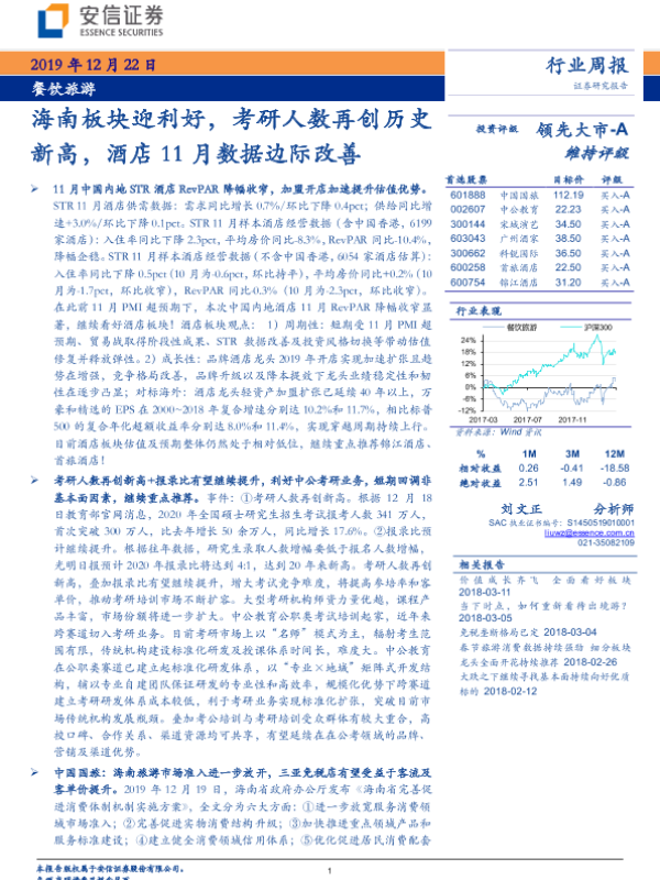 【安信证券】【20191222】餐饮旅游行业周报:海南板块迎利好,考研人数再创历史新高,酒店11月数据边际改善-17页 行业研究