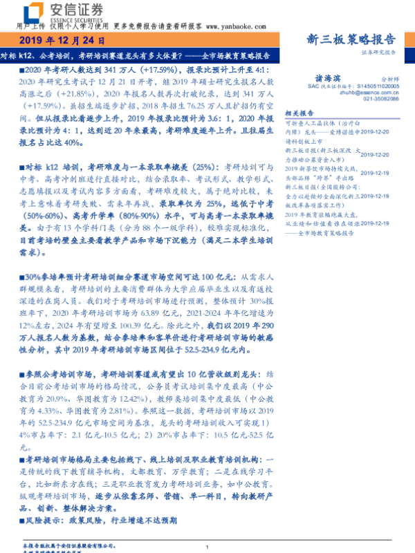 【安信证券】【20191224】全市场教育行业策略报告:对标k12、公考培训,考研培训赛道龙头有多大体量?-20页 证券期货研究报告