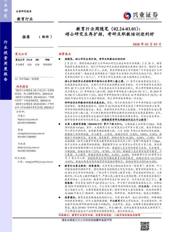 【兴业证券】【20200303】教育行业周随笔(02.24-03.01): 硕士研究生再扩招,考研及职教培训迎利好-15页 行业研究
