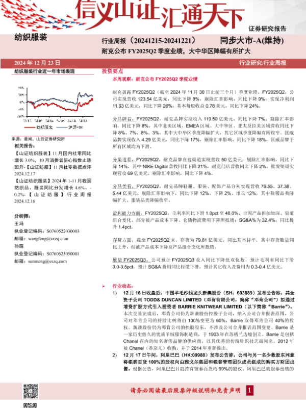 【山西证券】【20241223】纺织服装行业周报:耐克公布FY2025Q2季度业绩,大中华区降幅有所扩大-19页 行业研究
