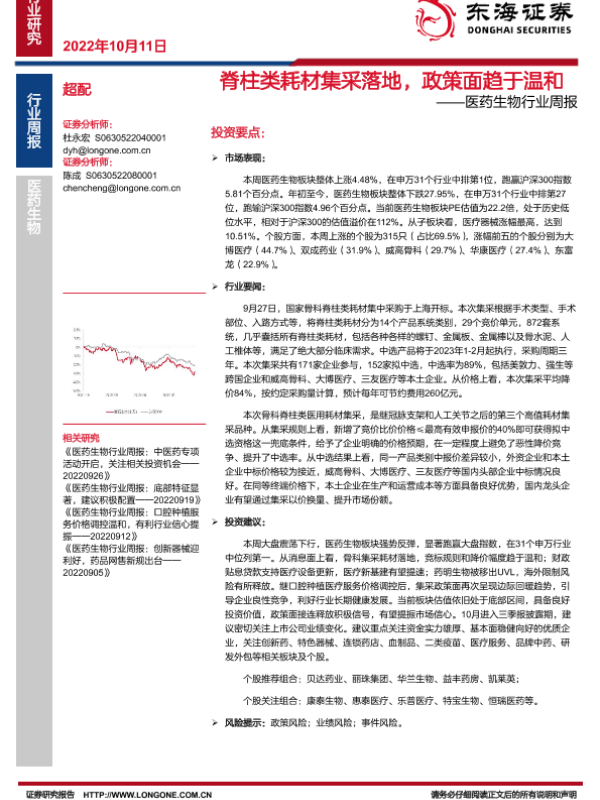【东海证券】【20221011】脊柱类耗材集采落地,政策面趋于温和-11页 行业研究