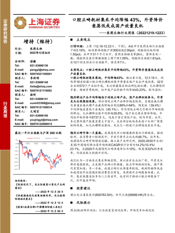 【上海证券】【20221226】医药生物行业周报:口腔正畸耗材集采平均降幅43%,外资降价意愿低或成国产放量良机-20页 行业研究