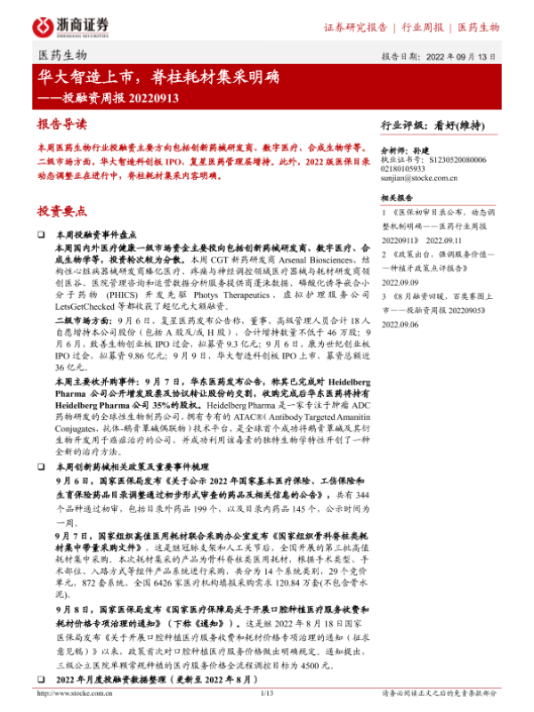 【浙商证券】【20220913】医药生物投融资周报:华大智造上市,脊柱耗材集采明确-13页 行业研究