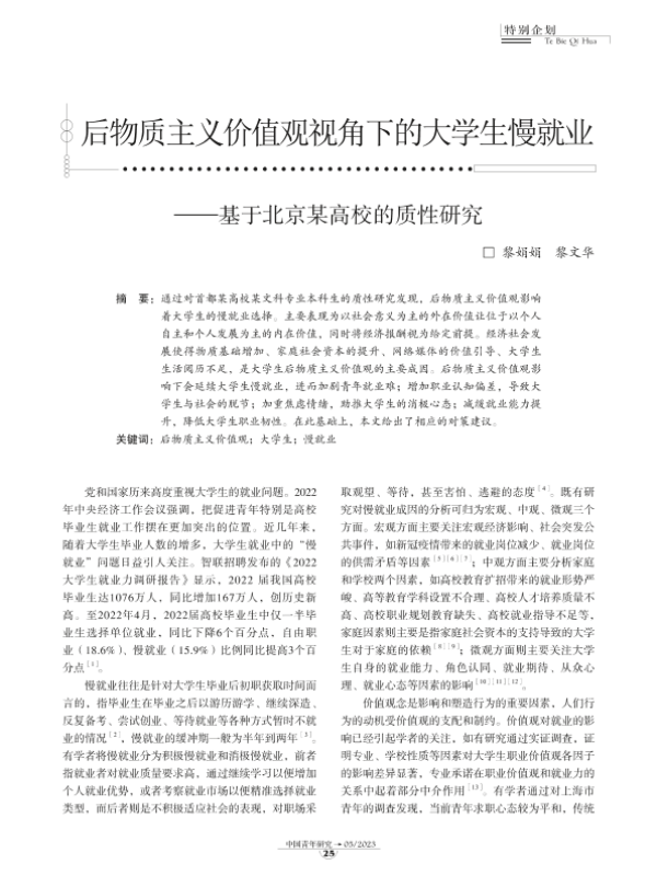 【中国青年研究】【20230501】后物质主义价值观视角下的大学生慢就业——基于北京某高校的质性研究-9页 行业研究