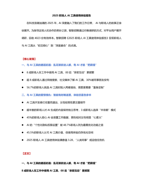 【智联招聘】【2025】2025职场人AI工具使用体验报告-9页 市场调研