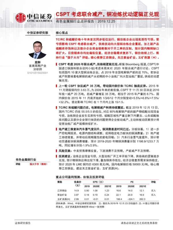 【中信证券】【20191225】有色金属铜行业点评报告:CSPT考虑联合减产,铜冶炼扰动逻辑正兑现-2页 行业研究