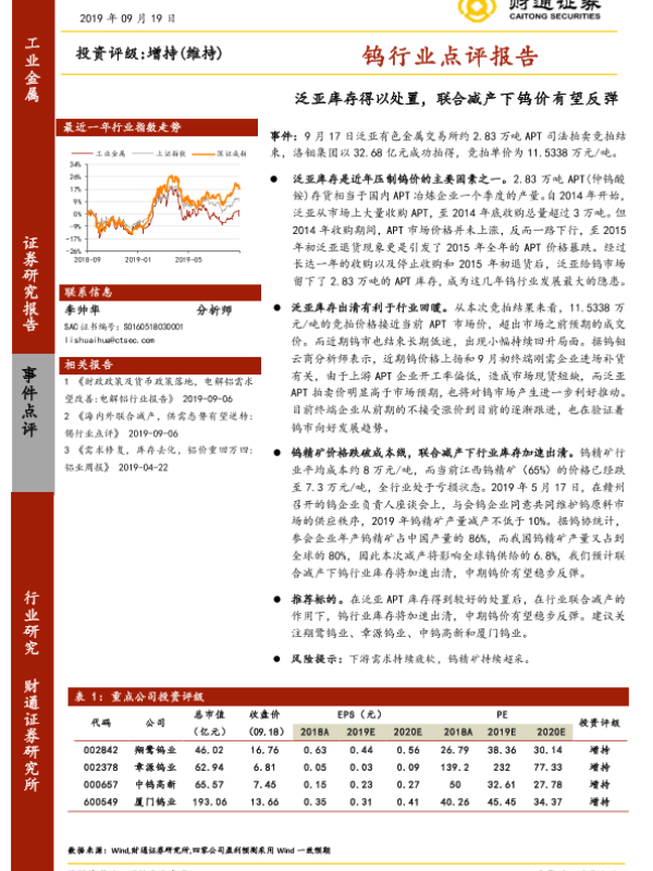 【财通证券】【20190919】钨行业点评报告:泛亚库存得以处置,联合减产下钨价有望反弹-2页 行业研究
