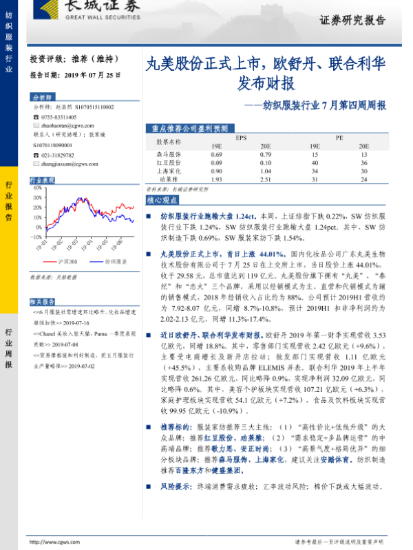 【长城证券】【20190725】20190725-长城证券-纺织服装行业7月第四周周报:丸美股份正式上市,欧舒丹、联合利华发布财报-21页 行业研究
