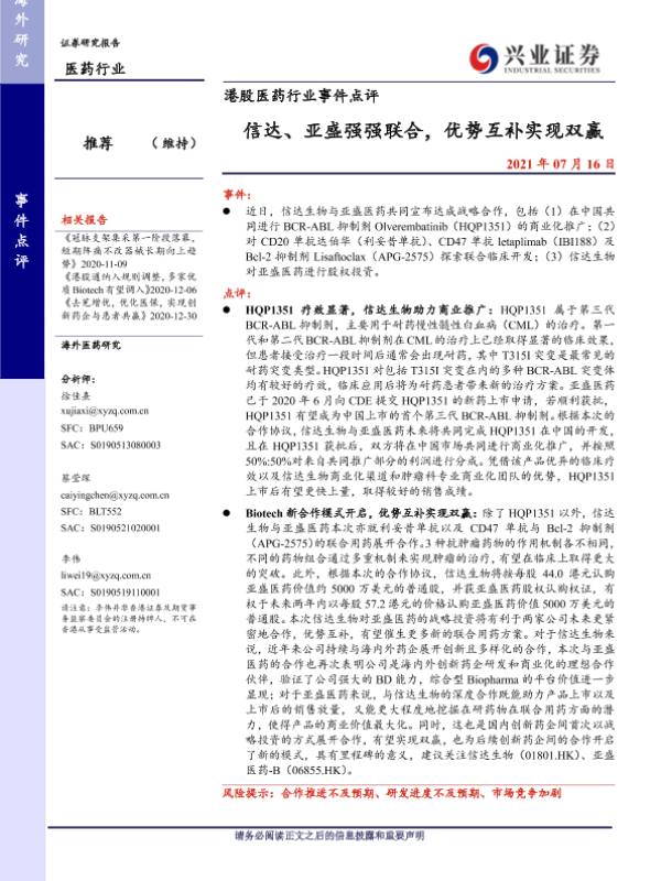 【兴业证券】【20210716】信达、亚盛强强联合,优势互补实现双赢-4页 行业研究