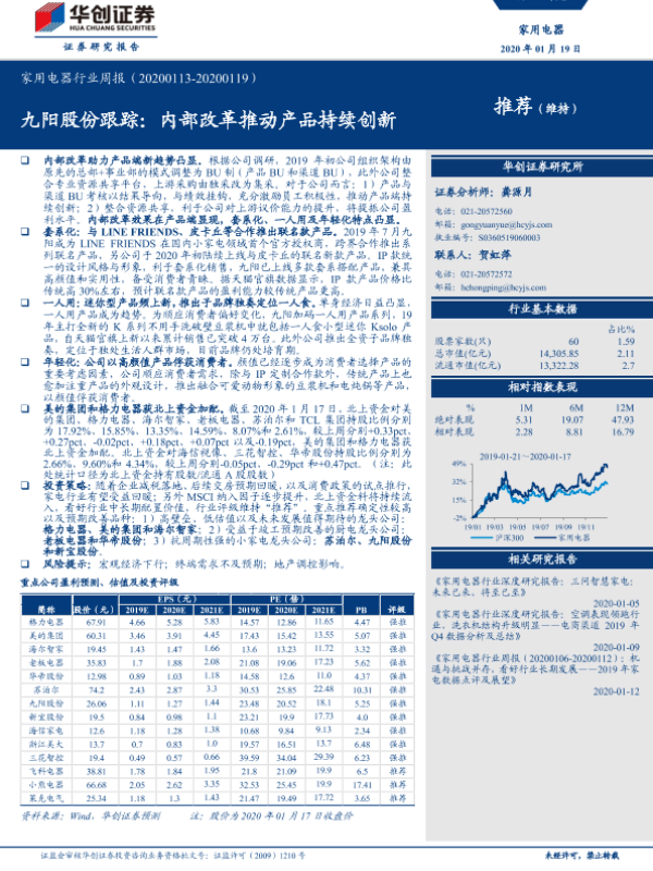 【华创证券】【20200119】家用电器行业周报:九阳股份跟踪:内部改革推动产品持续创新-15页 行业研究