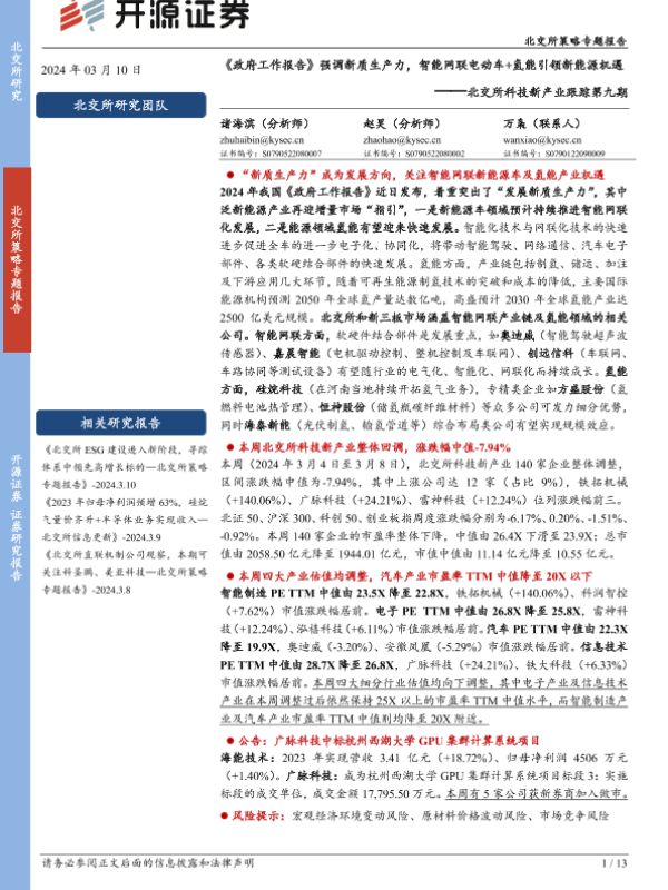 【开源证券】【20240310】北交所科技新产业跟踪第九期:《政府工作报告》强调新质生产力,智能网联电动车+氢能引领新能源机遇-13页 行业研究