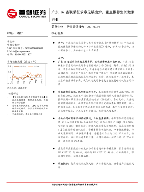 【首创证券】【20210719】广东16省联采征求意见稿出炉,重点推荐生长激素行业-3页 行业研究