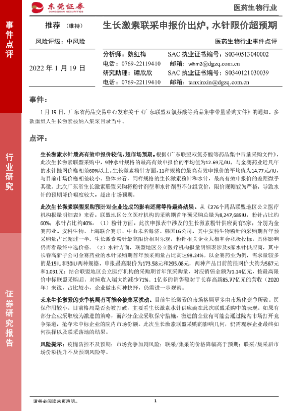 【东莞证券】【20220119】医药生物行业事件点评:生长激素联采申报价出炉,水针限价超预期-2页 行业研究