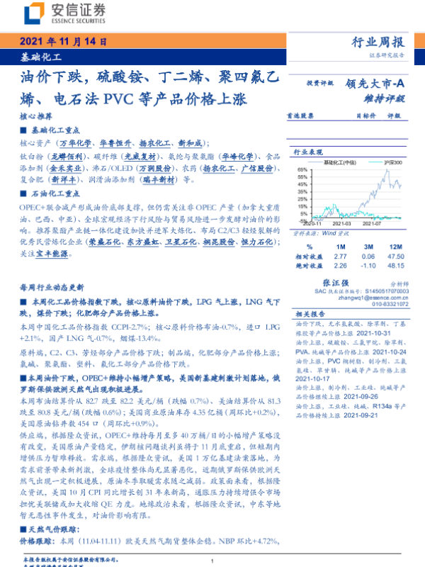 【安信证券】【20211114】基础化工行业周报:油价下跌,硫酸铵、丁二烯、聚四氟乙烯、电石法PVC等产品价格上涨-5页 行业研究