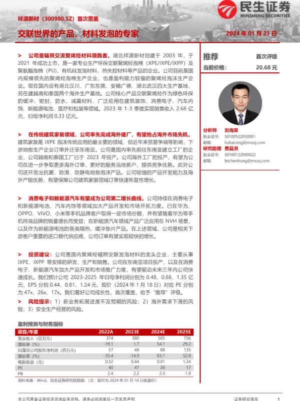 【民生证券】【20240121】祥源新材(300980.SZ)首次覆盖:交联世界的产品,材料发泡的专家-30页 行业研究