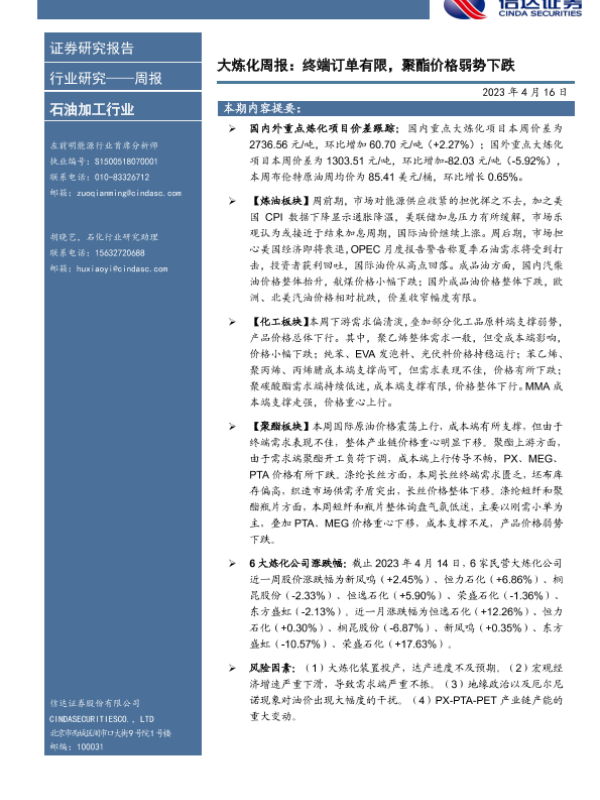 【信达证券】【20230416】大炼化周报:终端订单有限,聚酯价格弱势下跌-20页 行业研究