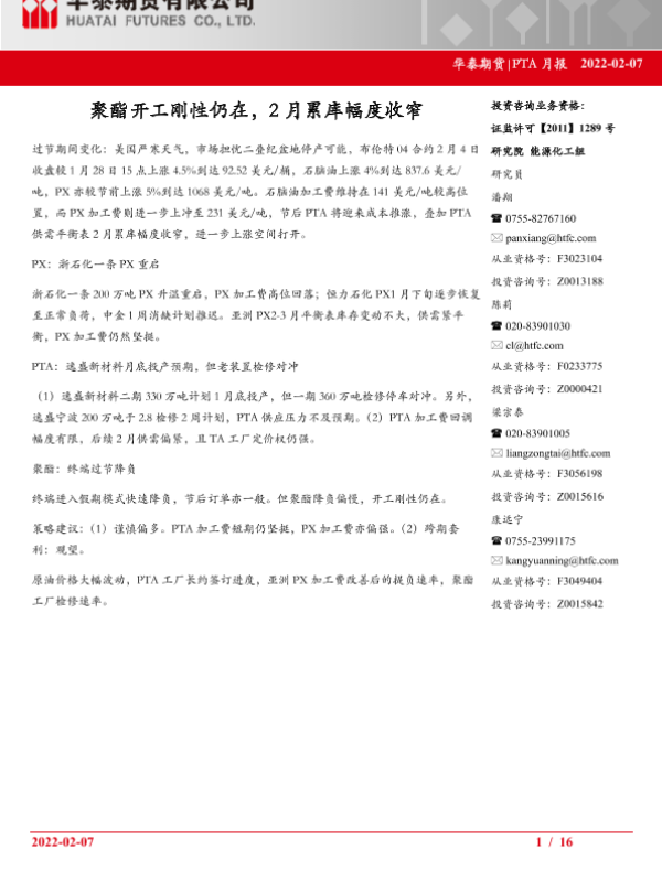 【华泰期货】【20220207】PTA月报_聚酯开工刚性仍在_2月累库幅度收窄-16页 行业研究
