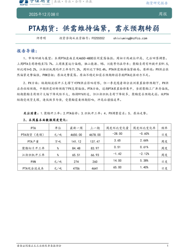 【宁证期货】【202512】PTA期货:供需维持偏紧,需求预期转弱-7页 证券期货研究报告